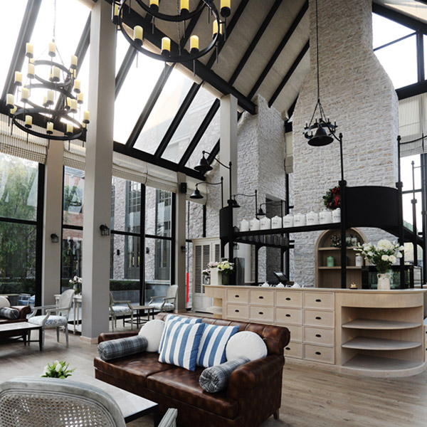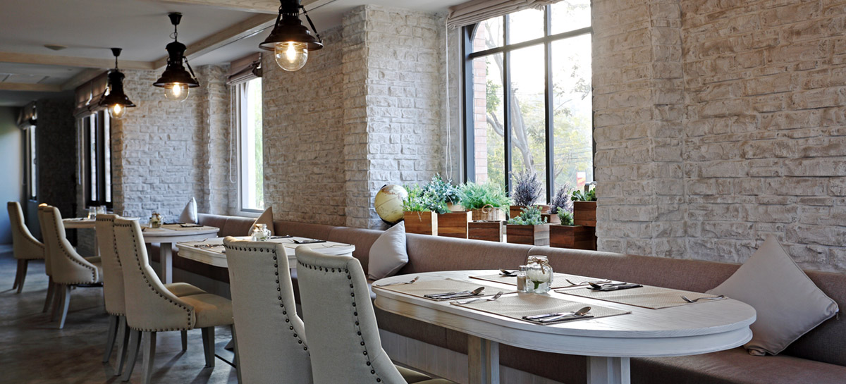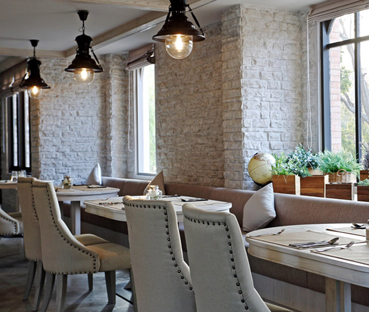 Here patrons relax in the cozy, warm atmosphere of a grand English country home. High ceilings and stone surfaces give the feel of an old fortified English manor house. With impeccable service and faultless cuisines, guests can enjoy a perfect dining experience, all in castle-like surroundings.